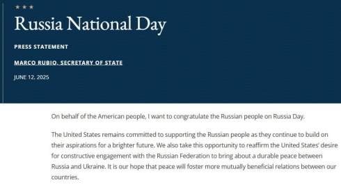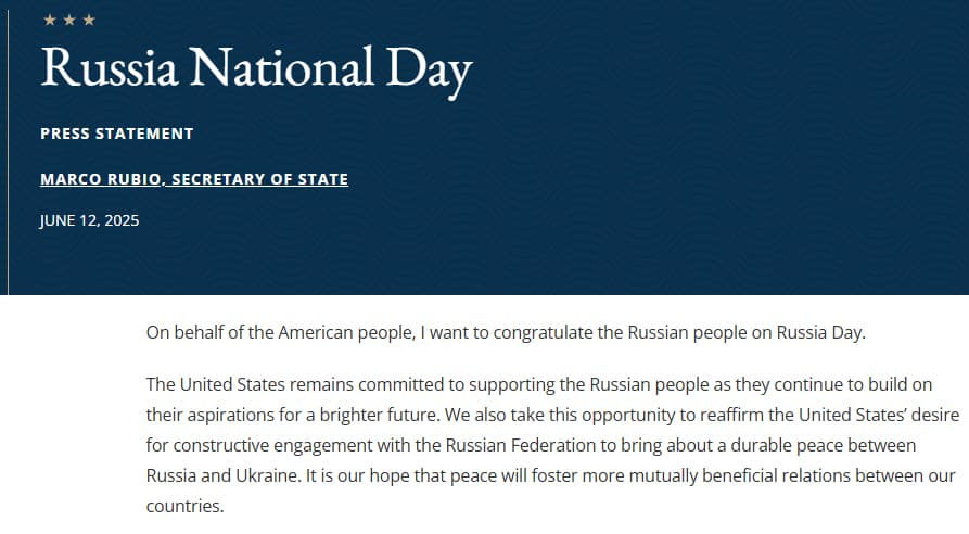 Державний секретар США Марко Рубіо опублікував офіційне привітання з Днем Росії.