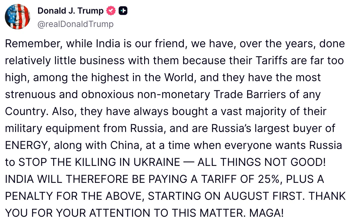 «Хоча Індія є нашим другом, ми протягом багатьох років мали з ними відносно мало справ, тому що їхні тарифи занадто високі, одні з найвищих у світі, і вони мають найжорсткіші та найнеприємніші немонетарні торговельні бар'єри серед усіх країн. Крім того, вони завжди купували більшість свого військового обладнання у Росії та є найбільшим покупцем енергії в Росії, поряд з Китаєм, у той час, коли всі хочуть, щоб Росія припинила вбивства в Україні», - написав американський лідер у власній мережі TruthSocial.