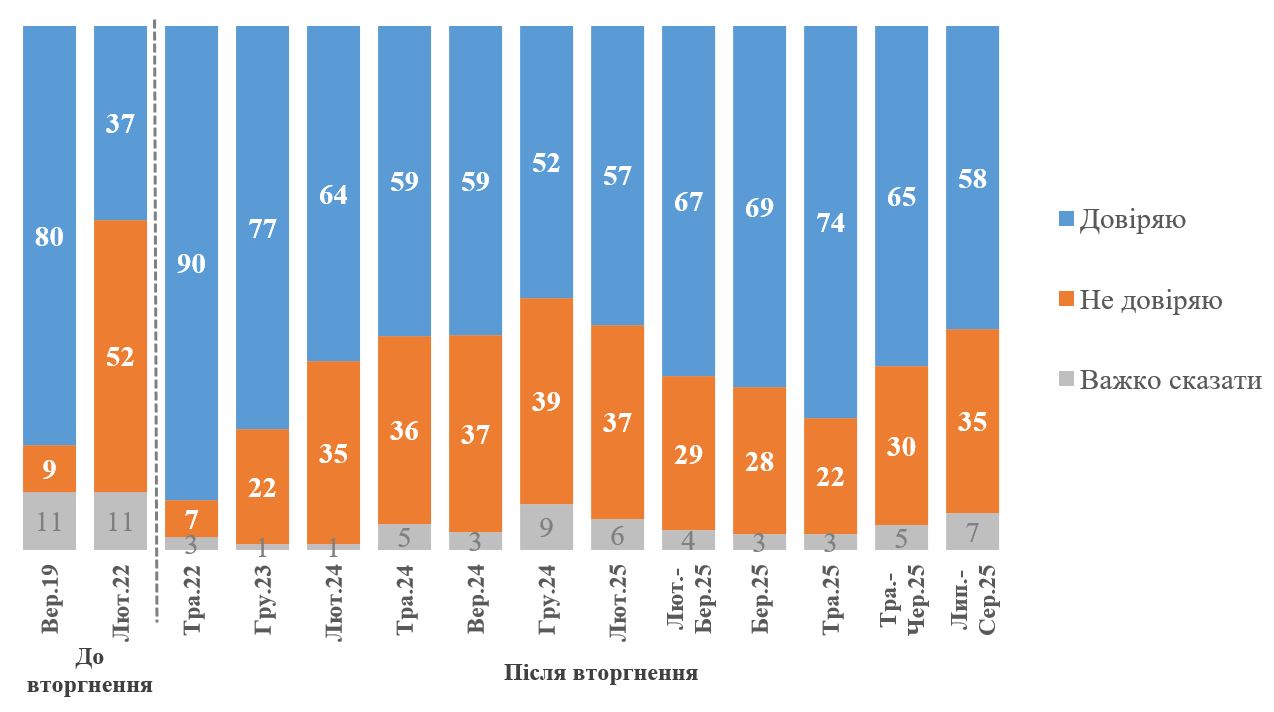 Після початку повномасштабного вторгнення в 2022 році рівень довіри Президенту сягнув 90%, але далі знижувався і відносно найнижчий показник ми зафіксували в грудні 2024 року - 52% (що, утім, все одно свідчило про досить високу довіру і про збереження позитивного балансу довіри-недовіри). У першій половині 2025 року, переважно через нову адміністрацію в США, рівень довіри Президенту зріс і сягнув максимальних 74% на початку травня 2025 року (одразу після підписання Угоди про копалини і напередодні відновлення перемовин з Росією, з якими деякі громадяни пов'язували оптимістичні очікування). Проте вже далі в другій половині травня-на початку червня 2025 року довіра почала знижуватися і на початку літа становила 65%.