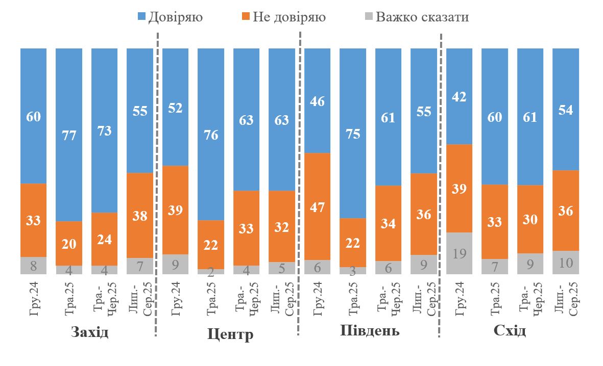 У Центрі рівень довіри не змінився (63% на початку літа і стільки ж зараз). На Півдні і Сході також є зниження, але в меншій мірі, ніж на Заході. Так, на Півдні рівень довіри знизився з 61% до 55%, на Сході - з 61% до 54%.