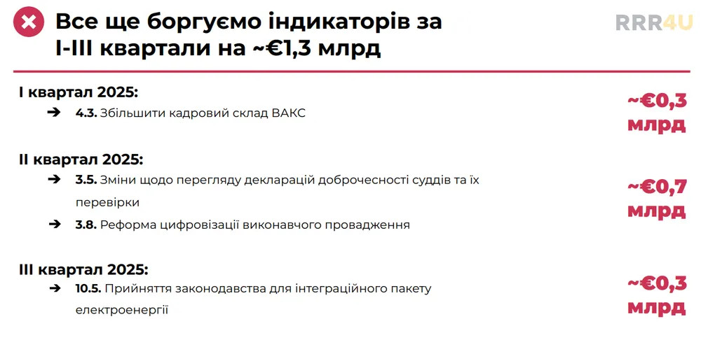 "Переважна більшість цих індикаторів є законодавчими ініціативами, ухвалення яких належить до зони відповідальності Верховної Ради України, що підкреслює важливість повернення відповідальності парламенту у забезпеченні повноцінного доступу України до фінансування в межах Ukraine Facility", - йдеться в заяві RRR4U.